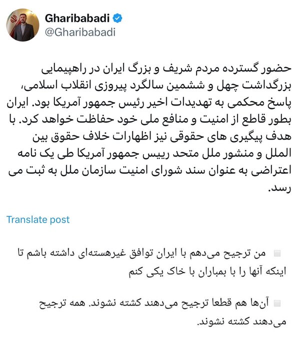معاون حقوقی و بینالملل وزارت امور خارجه در پیام خود، بخشی از سخنان اخیر دونالد ترامپ، رئیس جمهور ایالات متحده را نیز بازنشر کرده است. اشاره غریبآبادی به سخنان اخیر رئیس جمهور ایالات متحده در مصاحبهای با شبکه فاکسنیوز است که با تکرار ادعاهای بیپایه و اساس درباره برنامه هستهای ایران گفته بود: « «همه تصور میکنند که اسرائیل با کمک و تایید ما ایران را بمباران خواهد کرد. ترجیح من این است که چنین اتفاقی نیفتد. به شدت ترجیح میدهم که یک توافق با ایران را ببینم. من ترجیح میدهم توافقی داشته باشیم که به آنها آسیب نزند.»